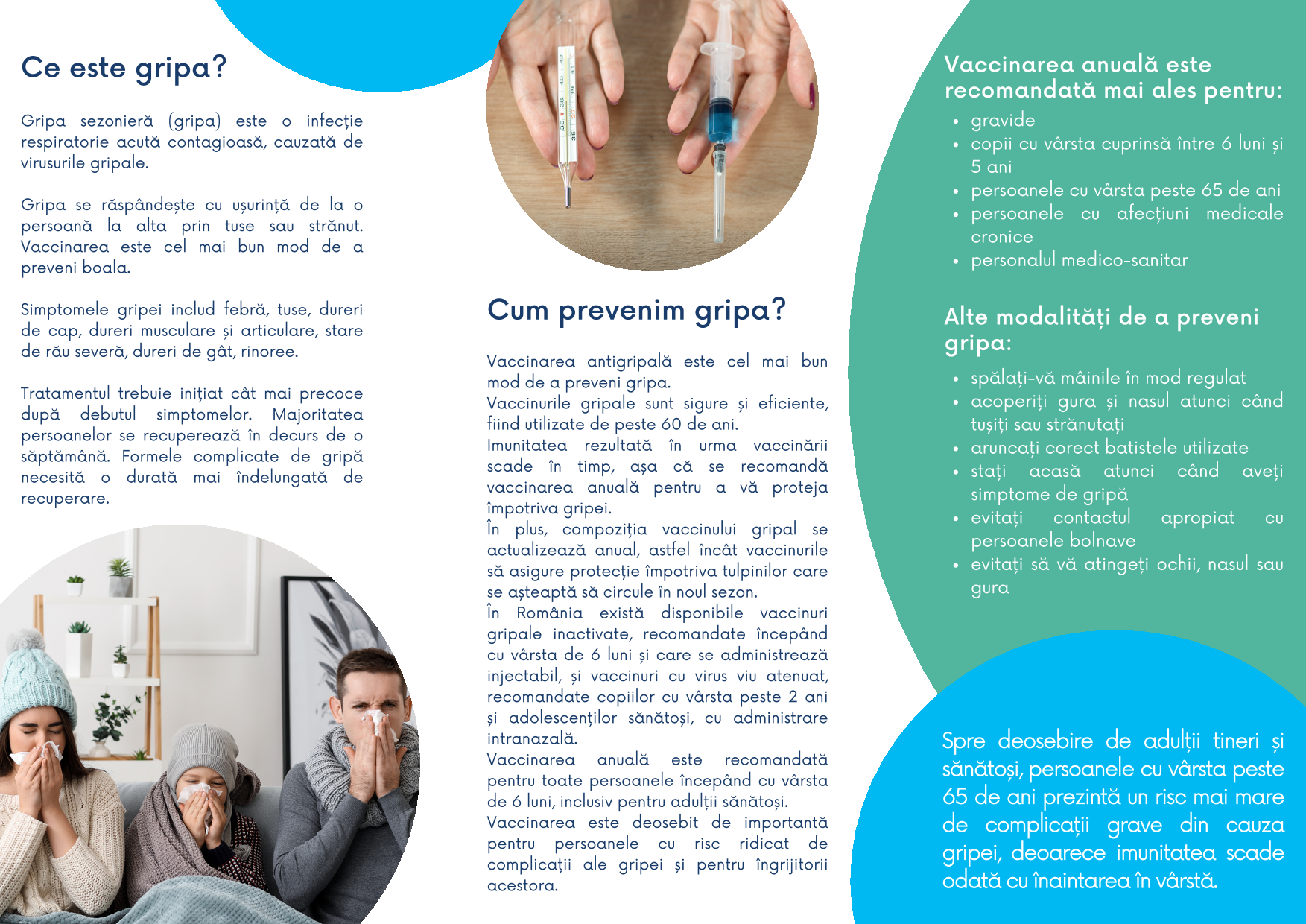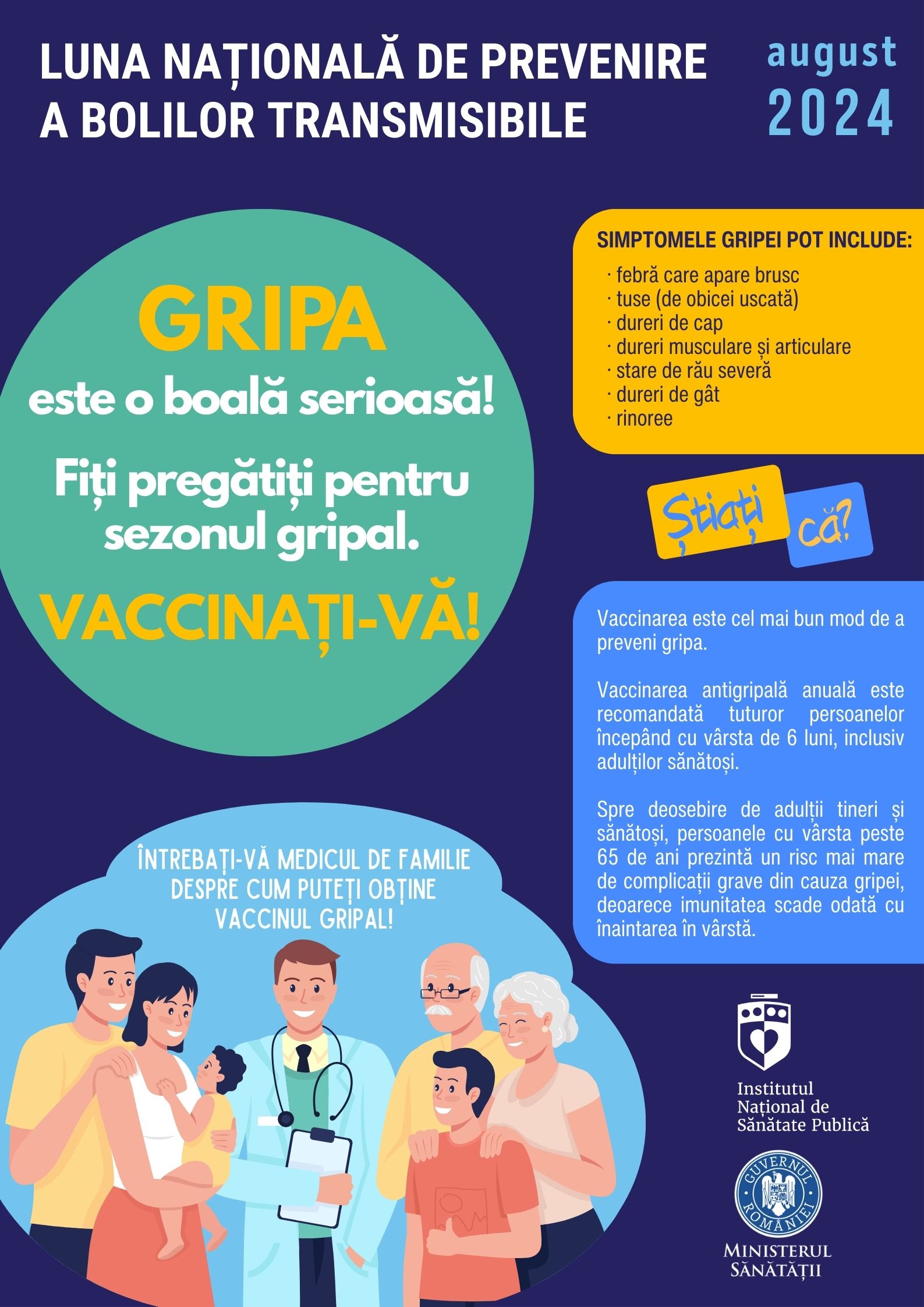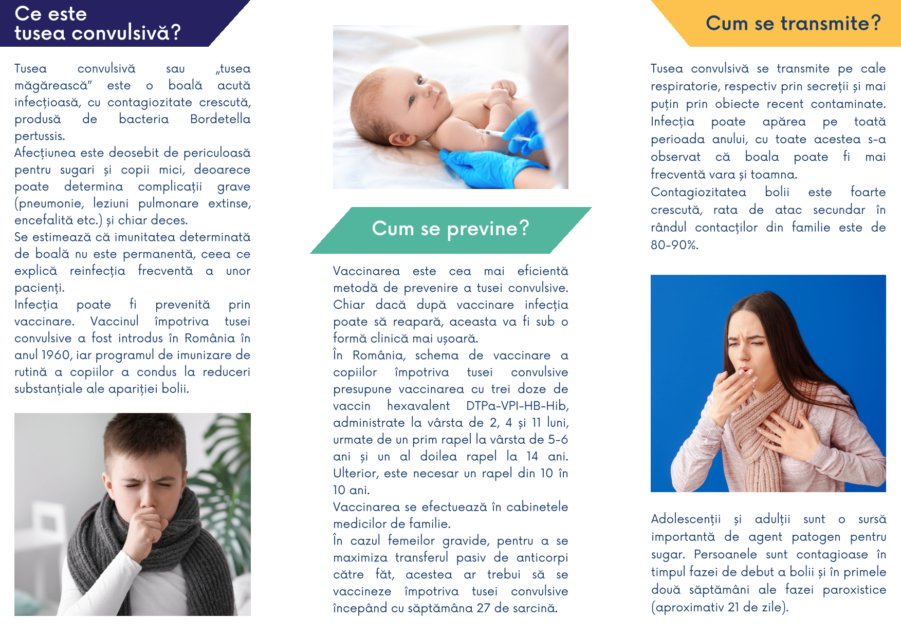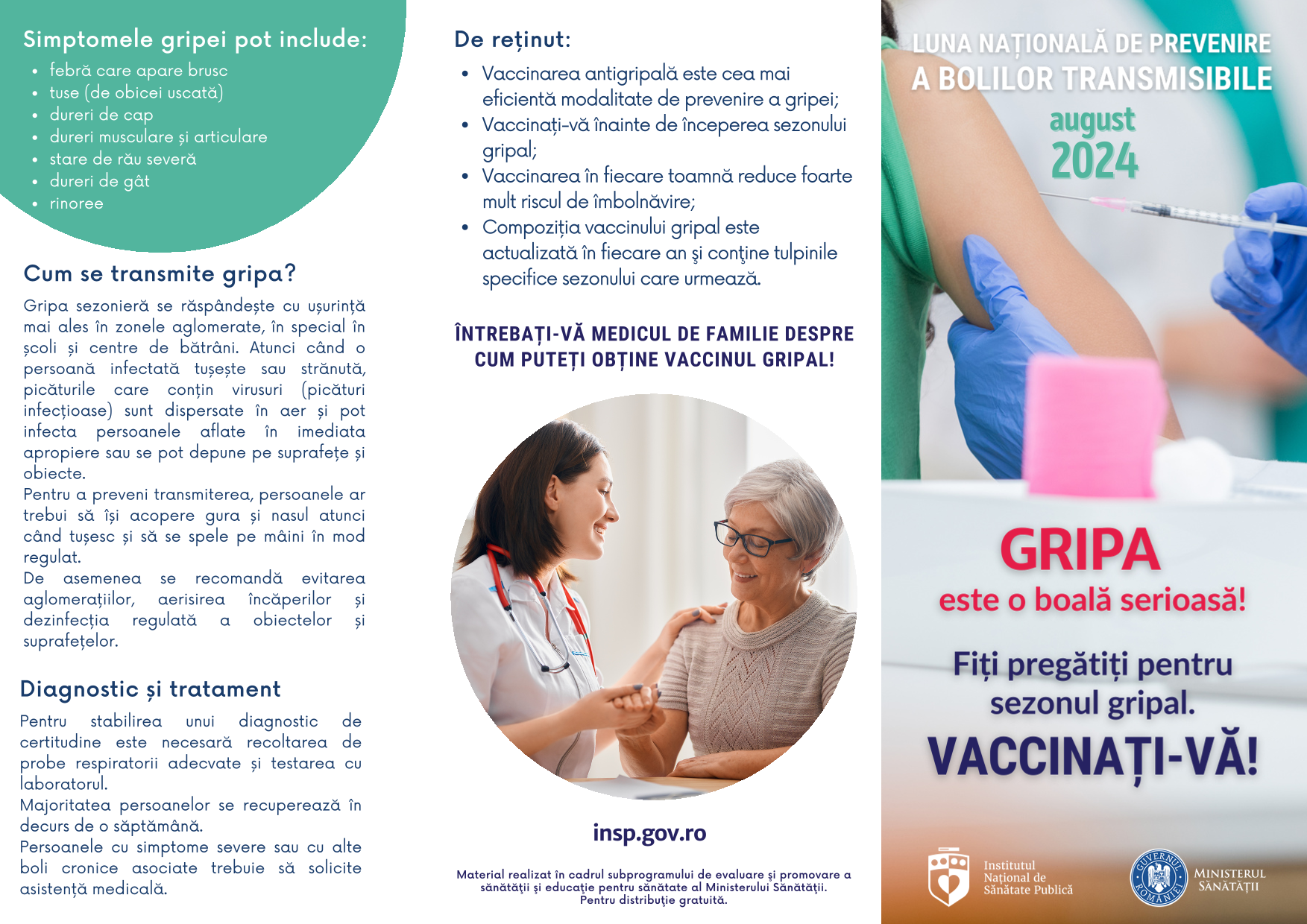 icon 03.08.2024 - Educație pentru sănătate Campania august- Luna Nationala de Prevenire a Bolilor Transmisibile. (2) Fisiere ataşate Pliant Gripa 1 Pliant Gripa 2 Poster Gripa Modificat Pliant Tusea convulsiva Pliant Tusea convulsiva 2 Poster Tusea convulsiva Vaccinuri compensate RO