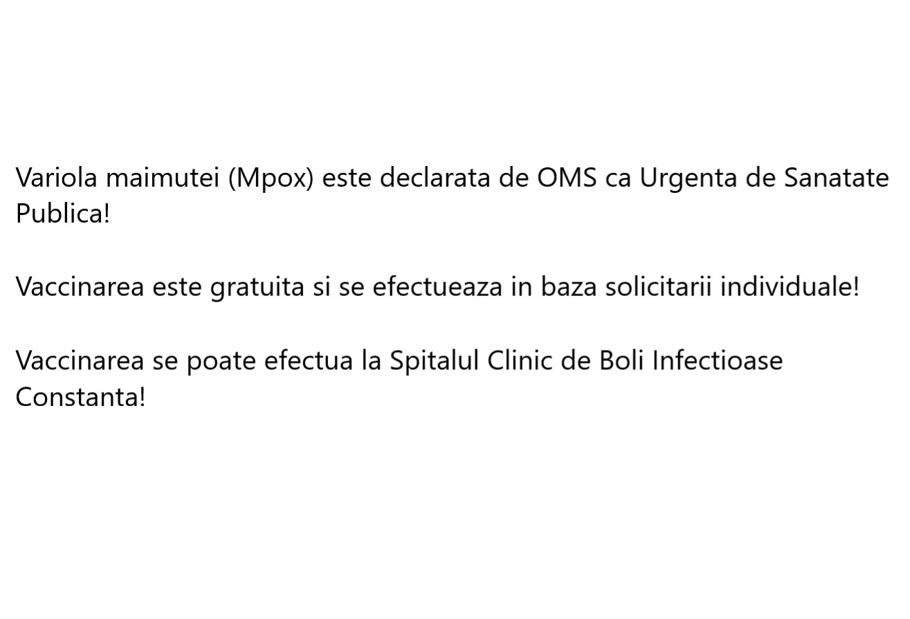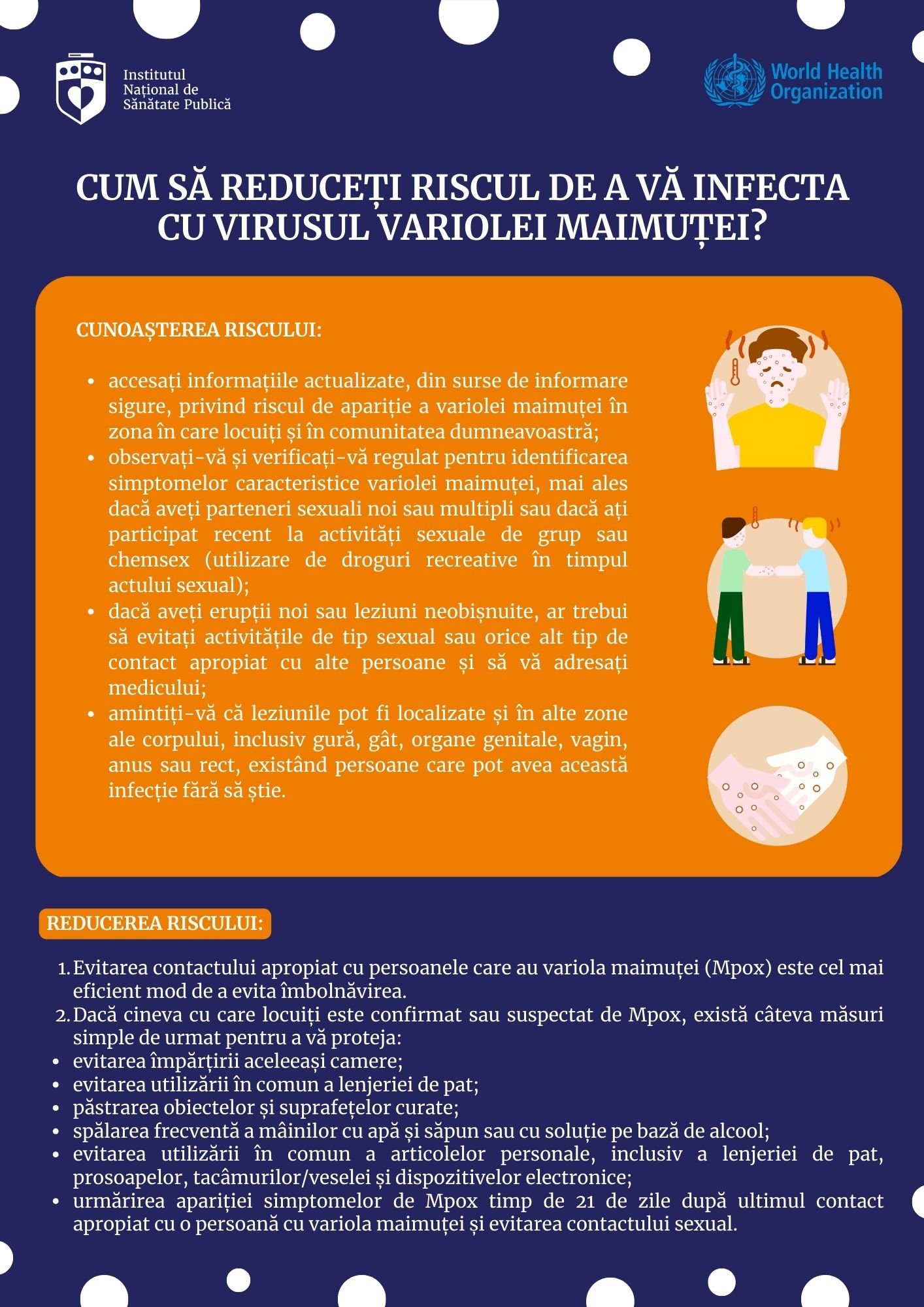 icon 27.08.2024 - Educație pentru sănătate Campania de informare privind infectia cu virusul variolei maimutei. Fisiere ataşate Afis Variola maimutei Slide Variola maimutei 1 Slide Variola maimutei 2 Slide Variola maimutei 3 Slide Variola maimutei 4