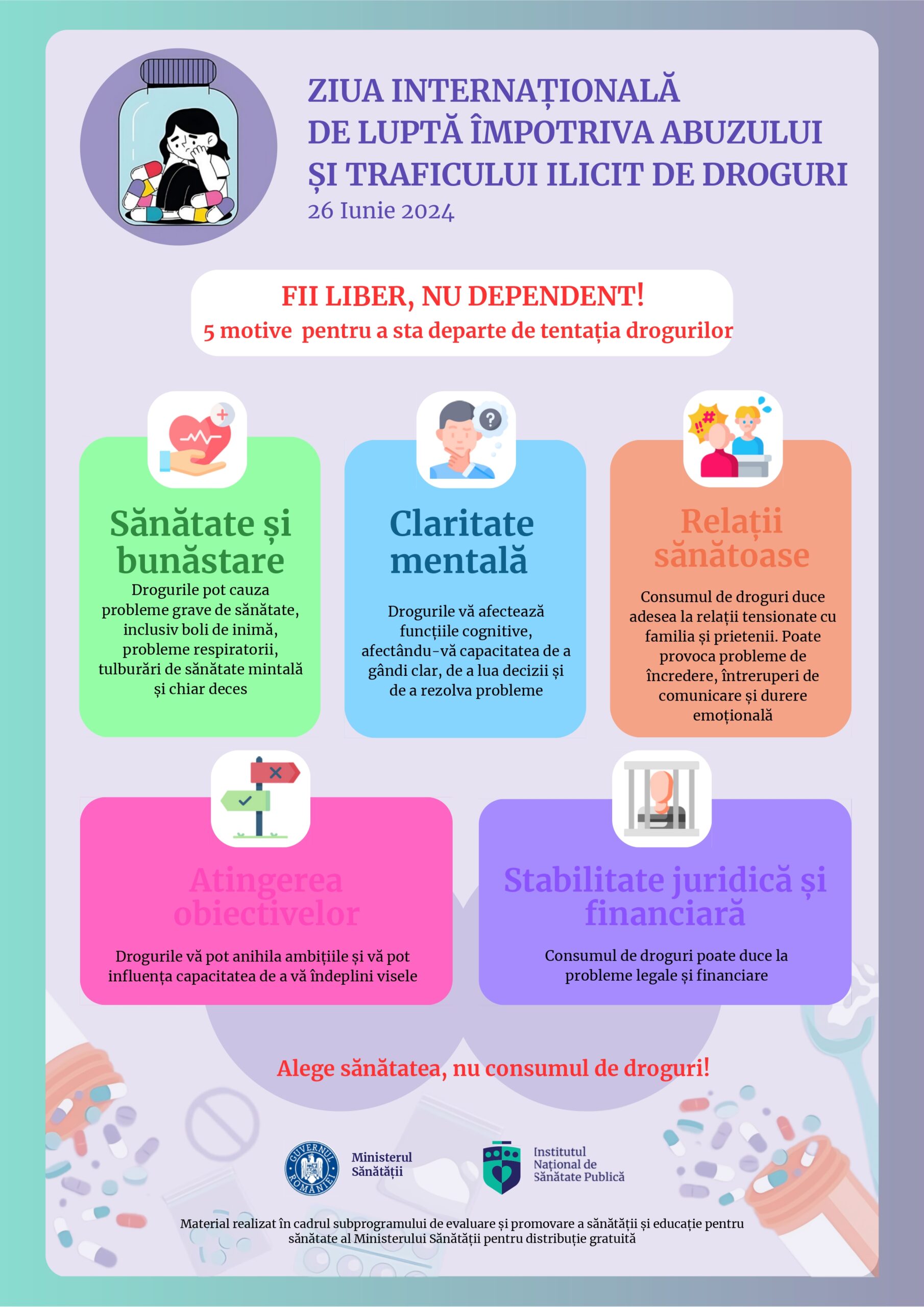 icon 26.06.2024 - Educație pentru sănătate Ziua Internaţională de Luptă Împotriva Abuzului şi Traficului Ilicit de Droguri Fisiere ataşate Comunicat presa - Ziua impotriva abuzului de droguri Poster - FII LIBER NU DEPENDENT
