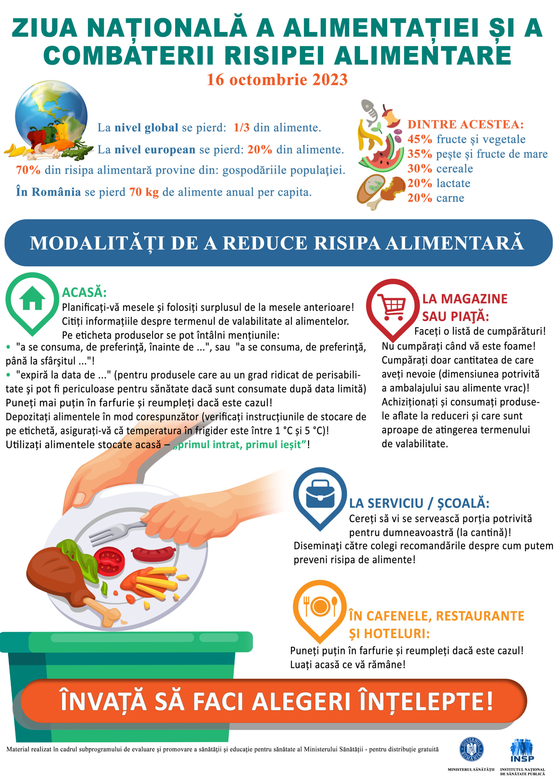 icon 16.10.2023 - Educație pentru sănătate ZIUA NAȚIONALĂA ALIMENTAȚIEI ȘI A COMBATERII RISIPEI ALIMENTARE Fisiere ataşate Poster risipa alimentara Comunicat presa risipa alimentara 2023